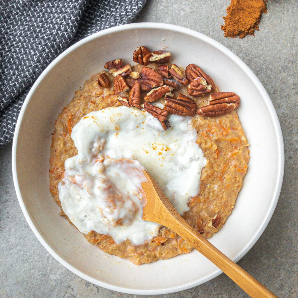 The taste of carrot cake in a delicious bowl of oats!Make sure the oats are thick and add some yoghurt to make it creamy.