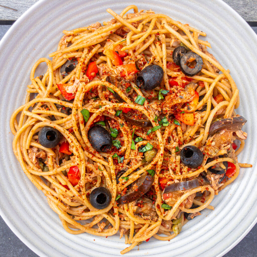 Tuna pasta with olives and capers