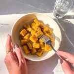 - Doe de gnocchi in een koekenpan en bak ze goudbruin. Voeg je favoriete saus toe (ik gebruikte pesto).