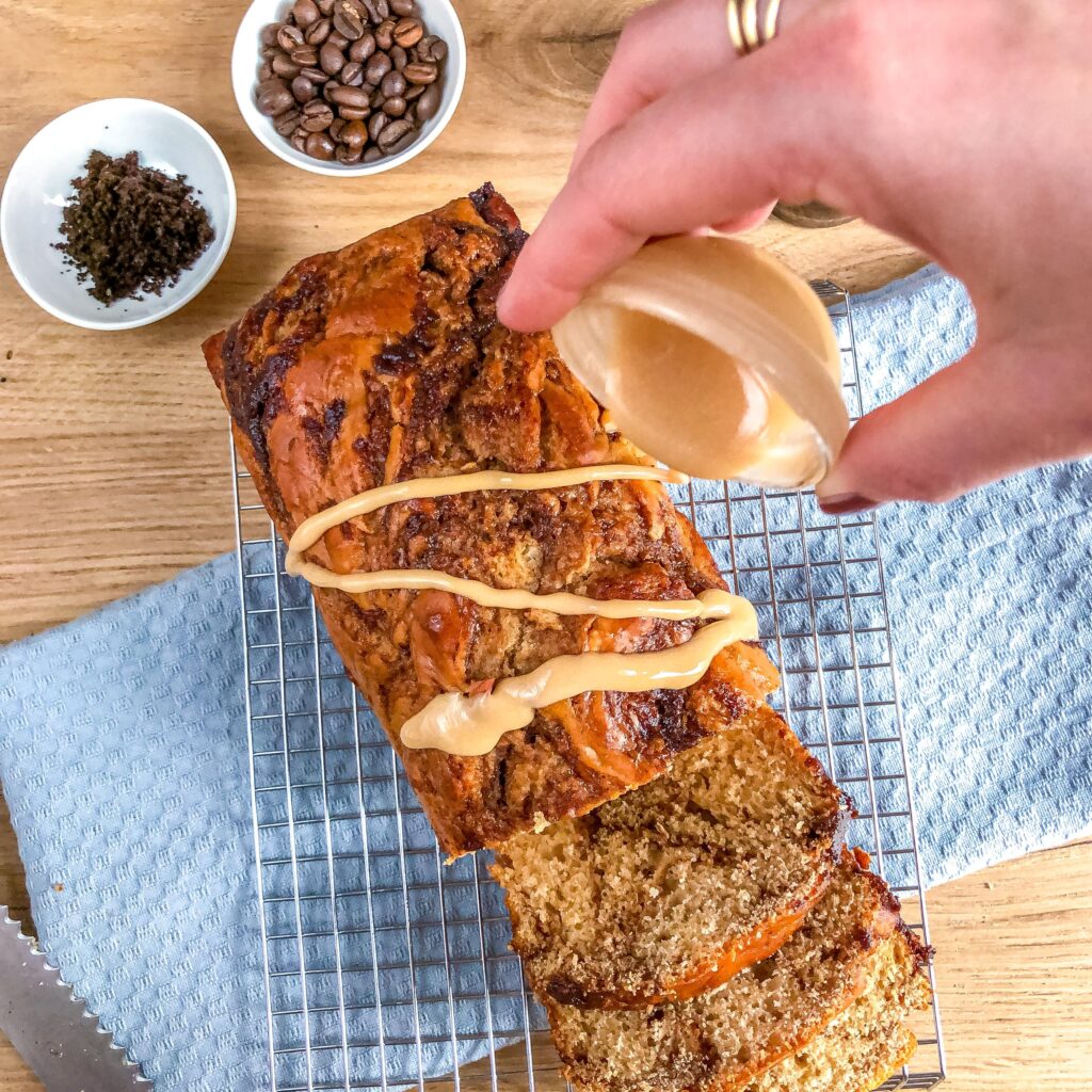 A super fluffy cinnamon loaf with a sweet filling of coffee and a coffee drizzle on top! The dream of every coffee lover.