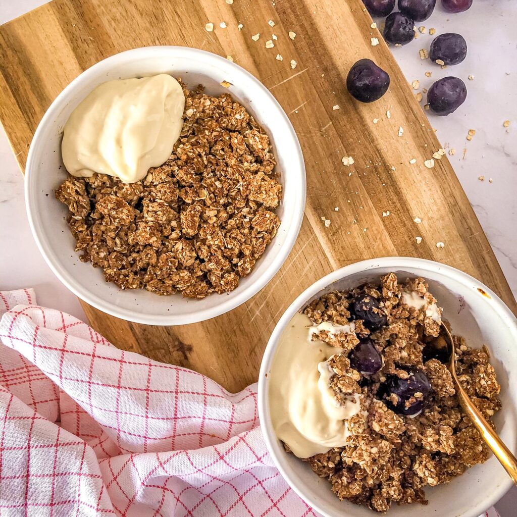 Dessert for breakast without feeling guilty, because it is completely healthy! A crispy crumble covers the sweet cherry pieces and the yoghurt add a nice creamy twist.